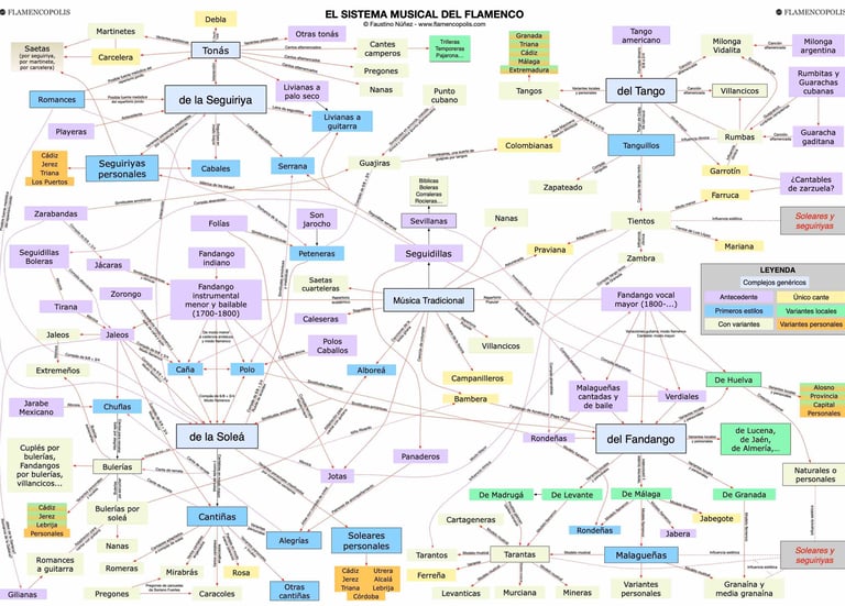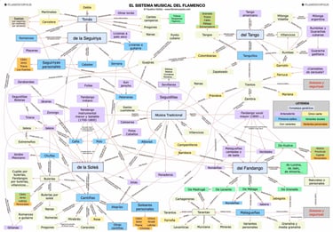 El mapa de los estilos del flamenco, llamados popularmente palos, forman un sistema debido a las interacciones que se producen entre ellos logrando una estética musical común que reconocemos como flamenco. En este mapa los estilos tienen, como se explica en la leyenda, cada uno un color que lo identifica en su calidad de antecedente, con variantes, etc. las medidas del mural son 100x 70cm.